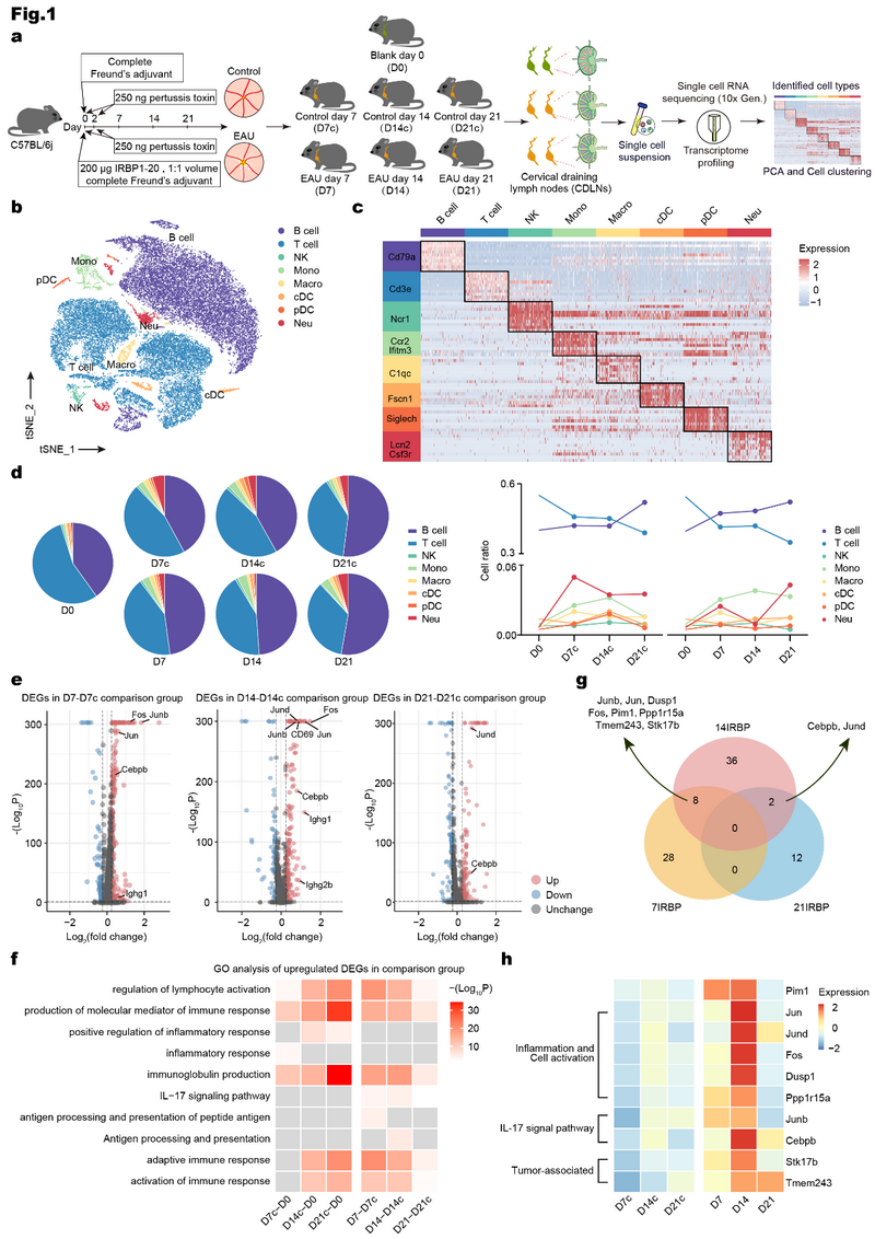 各種免疫細胞的異常是葡萄膜炎中自身免疫破壞的關(guān)鍵因素。其中,Th17細胞主導(dǎo)EAU發(fā)病機制。自身反應(yīng)性Th17細胞的轉(zhuǎn)移可在幼稚小鼠中誘導(dǎo)EAU。此外,越來越多的證據(jù)支持B細胞在EAU中的疾病促進作用。然而,缺乏對CD4+T細胞和B細胞的調(diào)節(jié)以及與葡萄膜炎進展相關(guān)的變化的清晰描述。淋巴結(jié)(LN)對自身免疫過程至關(guān)重要。作為各種免疫細胞,特別是T細胞、B細胞和樹突狀細胞(DC)之間相互作用的部位,LNs促進抗原呈遞、免疫細胞激活和自身免疫反應(yīng)啟動。頸部引流淋巴結(jié)(CDLN)是促進大分子和免疫細胞從中樞神經(jīng)系統(tǒng)有效引流的主要淋巴結(jié)。