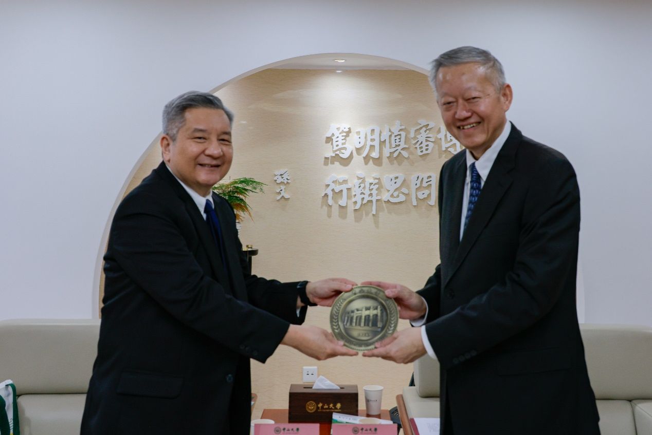 中山大學(xué)黨委書記陳春聲向亞典耀大學(xué)校長Roberto C. Yap贈送紀念品(來源:黨委宣傳部 嚴瑾攝)