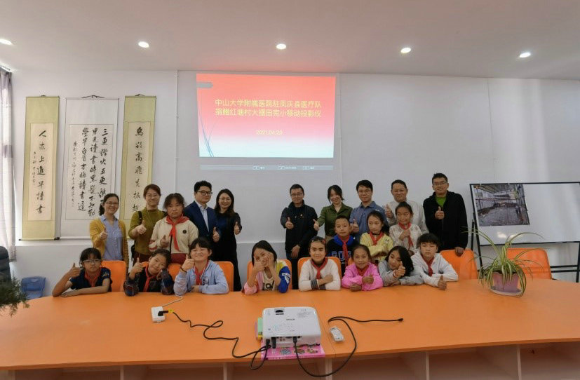 幫扶醫(yī)生們?yōu)榧t塘村小學(xué)捐贈(zèng)投影儀(來(lái)源:孫逸仙紀(jì)念醫(yī)院)