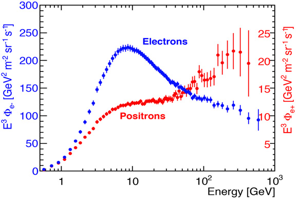1932年Carl Anderson在宇宙射線中發現了正電子。太空中及地表的非磁探測器只能測量電子與正電子的總通量。過去五十年中有許多的實驗測量宇宙射線電子與正電子的總通量。它們得到有趣的結果,其中幾個實驗顯示在300至800GeV間可能有一結構存在。