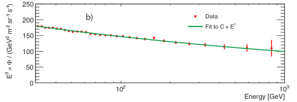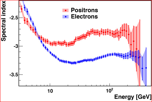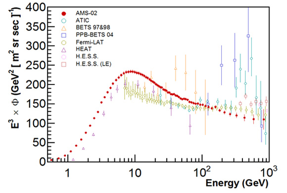 AMS也發表電子通量與正電子通量(即宇宙射線電子與正電子的強度)的精密量測。結果顯示電子與正電子不論在通量的強度或隨能量的變化上均顯著不同。圖三上圖展示電子通量及正電子通量(乘上能量的三次方以便于察看)隨能量的變化。乘方的正電子通量起先增加(在0.5至10GeV),接著變平緩(10至30GeV),隨后又增加(30至200GeV)。在200GeV以上則有降低之趨勢。此與乘方的電子通量,表現完全不同。