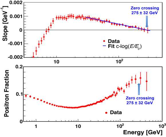AMS已分析了四百一十億件初級宇宙射線之事例,其中一千零九十萬件經辨認為電子與正電子。AMS測量了能量在5億至5千億電子伏特之間的“正電子分率”(即正電子數占電子與正電子總數之比例)。我們發現此分率在80億電子伏特時開始快速增加(如圖一),顯示有新的正電子源存在。圖二表示正電子分率隨能量增加而增加之速率已被精確測出,并無明顯之尖峰存在。正電子分率停止增加的能量(即分率達最大值時的轉折點之能量)經測得為275±32 GeV(1GeV為十億電子伏特),如圖二之上圖所示。此乃半世紀來的宇宙射線實驗首次看到正電子分率的最大值。多出的正電子分率在百分之三的誤差范圍內是各向同性的,強烈顯示高能量的正電子可能不是來自某些特定的方向。
