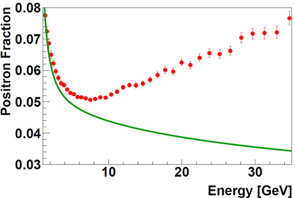 圖一 AMS測量的正電子分率(紅圈)與由平常宇宙射線碰撞的預測(綠線)比較顯示在80億電子伏特(8GeV)以上正電子分率開始快速增加。此增加指出新正電子源的存在。