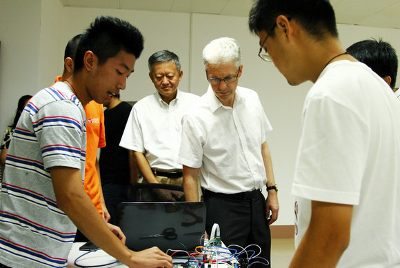 在陳春聲的陪同下,伊恩·懷特(Ian·White)一行參觀了我校移動信息工程學院,該院院長李文軍教授、副院長楊然教授等向嘉賓介紹了移動信息工程學院的辦學理念和基本情況。伊恩·懷特(Ian·White)還詳細了解了移動信息工程學院學生工程實訓作品,并與學生進行了親切交談。