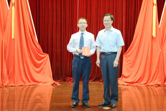 肖海鵬書記(右)為一等獎獲得者劉早華(左)頒發榮譽證書