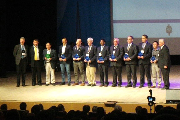 郭嵩山教授(左三)被授予綠色的高級教練獎牌,其余教練被授予的藍色教練獎牌是代表所帶領的隊伍有5次進入全球總決賽