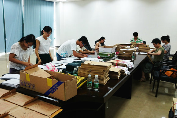 今年我校畢業生檔案有13000多份,而每份檔案都包括約10種從學校各職能部門產生的文件材料。如何將這些海量的檔案材料有條不紊、準確無誤地收集、分類、歸檔并裝入印有寄送地址的機密信封袋,是一項相當繁重的工作,考驗著老師們的腦力、體力和耐力。在人手緊缺的情況下,今年6月中旬開始,檔案館學生檔案室工作人員加班加點,利用正在調試的學生人事檔案系統,完成全部畢業生檔案的清點和機要三聯單、信封的打印工作,大大減輕了各院系的工作量,獲得了各院系負責畢業生工作老師的好評。從6月27日學期最后一天開始,檔案館組織各院系以及就業指導中心的老師們,頂著炎夏的高溫熱浪,汗流浹背地擠在東校區行政樓各會議室里集中整理畢業生檔案,每天工作下來往往是十多個小時。經過近一個月的艱苦奮戰,13000多份畢業生檔案順利完成歸檔工作。7月11日至14日,檔案館分三批將我校畢業生檔案送到廣東省機要局等相關的檔案承遞單位。