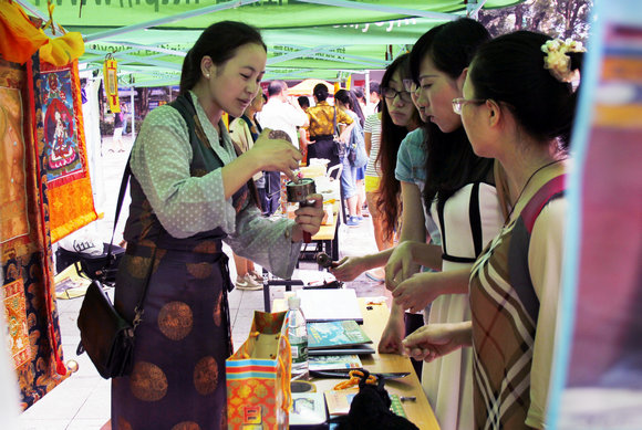 西藏民族學(xué)院交換生向參與者介紹藏族物品