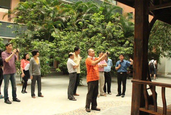 陳建存副書記引導校友們參觀了學院的“信雅園”主園、空中平臺、品閑齋等建筑,介紹了主園中“清靜門”、“潤芯亭”、“園記石”、乾坤二卦、鏡面太極圖和巧妙隱于園中的“79”、“83”字樣及其設計理念和文化涵義,說明了“信雅園”第一期建設的經費支出、建成使用的基本情況,感謝了校區給予的大力支持,并就捐贈余款的后續使用提出了建議。