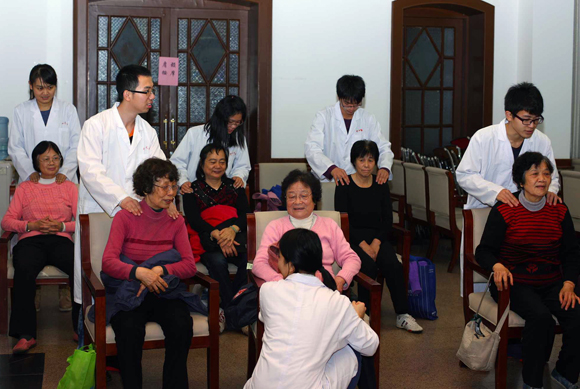 學生志愿者為老師們進行肩頸按摩