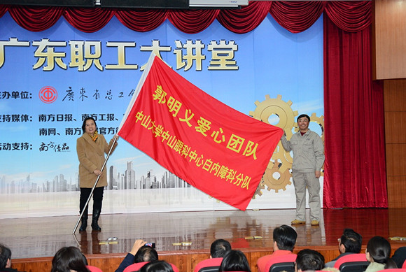 在當日的活動中,郭明義愛心團隊在廣東省成立分隊,中山眼科中心與廣東省總工會等省內其它8家單位獲得成立郭明義愛心分隊的資格。白內障專科主任陳偉蓉教授代表中心從郭明義手中接過“郭明義愛心團隊中山大學中山眼科中心白內障科分隊”的旗幟。