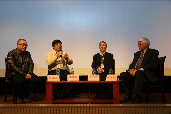 慶典儀式后,舉行第四屆新媒體學術年會。復旦大學新聞學院李良榮教授,中國社會科學院新聞與傳播研究所所長、研究生院新聞系主任唐緒軍教授,香港城市大學媒體與傳播系主任Jan Servaes教授,我校傳播與設計學院副院長、創意媒體設計系主任楊小彥教授等四位學者分別基于新聞教育、職業記者、信息傳播技術的發展和視覺時代的人文追問的視角,進行主題演講,并與在場觀眾互動討論。