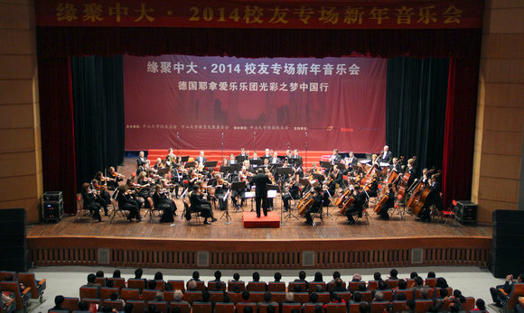 12月14日下午,“緣聚中大·2014校友專場新年音樂會”—— 德國耶拿愛樂樂團光彩之夢中國行在南校區梁球琚堂舉辦。此次音樂會由中山大學校友總會、中山大學教育發展基金會主辦,中山大學德國校友會承辦。校黨委副書記、校友總會常務副會長、教育發展基金會副理事長李萍出席了音樂會并致辭。校長助理陳紹彬、德國耶拿市市長Dr. Schr?ter、副市長Jauch以及中山大學德國校友會吳民智會長出席了音樂會。近1500位來自各地的中大人齊聚一堂,共敘情誼,歡慶新年,聆聽音樂盛宴。