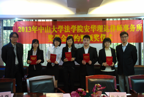 11月28日上午,我校法學院2013年度安華理達律師事務所獎學金簽約暨頒獎儀式舉行。安華理達律師事務所管理合伙人、主任潘衛思,高級合伙人黎建輝(潘衛思、黎建輝均系我校法律系本科1990級校友),人力資源部經理陳燕平、于玲;我校法學院院長徐忠明、院黨委書記羅鎮忠、副院長李摯萍、院黨委副書記陳方,以及本年度獲獎學生等出席了儀式。