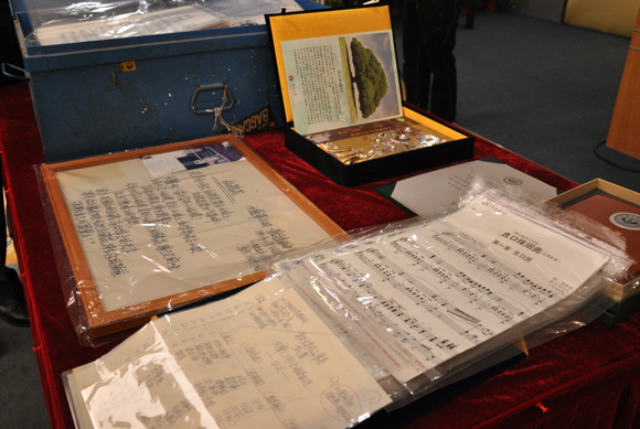 此次許伯夷先生所捐贈資料為黃友棣校友早年作曲真跡原件,包含“手稿”(手寫曲譜)、“制譜”(親自黏貼制譜的曲譜)、“校正”(印刷后,在譜上親自校對內容)、“樂譜”(印刷成品的曲譜)等一系列樂譜兩百多件,有獨唱曲、鋼琴曲、器樂曲、舞劇、歌劇、二部合唱曲、三部合唱曲、混聲合唱曲等。其中,就有黃友棣先生親手寫的《杜鵑花》歌詞,還有《良口烽煙曲》、中國民歌組曲(《剪剪花》《紅棉花開》、《迎春接福》等)和中國各地名歌近百首等。