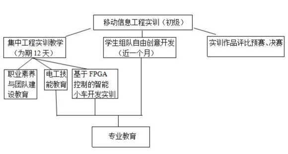 8月30日,學院迎來首次工程實訓——“移動信息工程實訓(初級)”,開始了這一培養模式的探索實踐。此次工程實訓面向學院2012級全體本科生,分三部分進行:第一部分是為期12天的集中工程實訓教學,包括職業素養與團隊建設教育、電工技能訓練、基于FPGA控制的智能小車開發實訓;第二部分是為期近一個月的學生組隊自由創意開發;第三部分是實訓作品展示及評比預賽與決賽。根據實訓內容,又分為專業教育、職業素養與團隊建設教育兩個模塊,其中專業教育由電工技能培訓、基于FPGA控制的智能小車開發與學生組隊自由創意開發三部分組成。(如架構圖所示)據李文軍院長介紹,專業教育的三個組成部分內容本身具有時序關系,層層深入;前兩種是“固定動作”,保證學生能力的培養,后一種是“自選動作”,給學生無限的發揮空間。實訓中,以兩個模塊為抓手,在教授學生知識、技能的同時,重視學生素質、素養的建設。