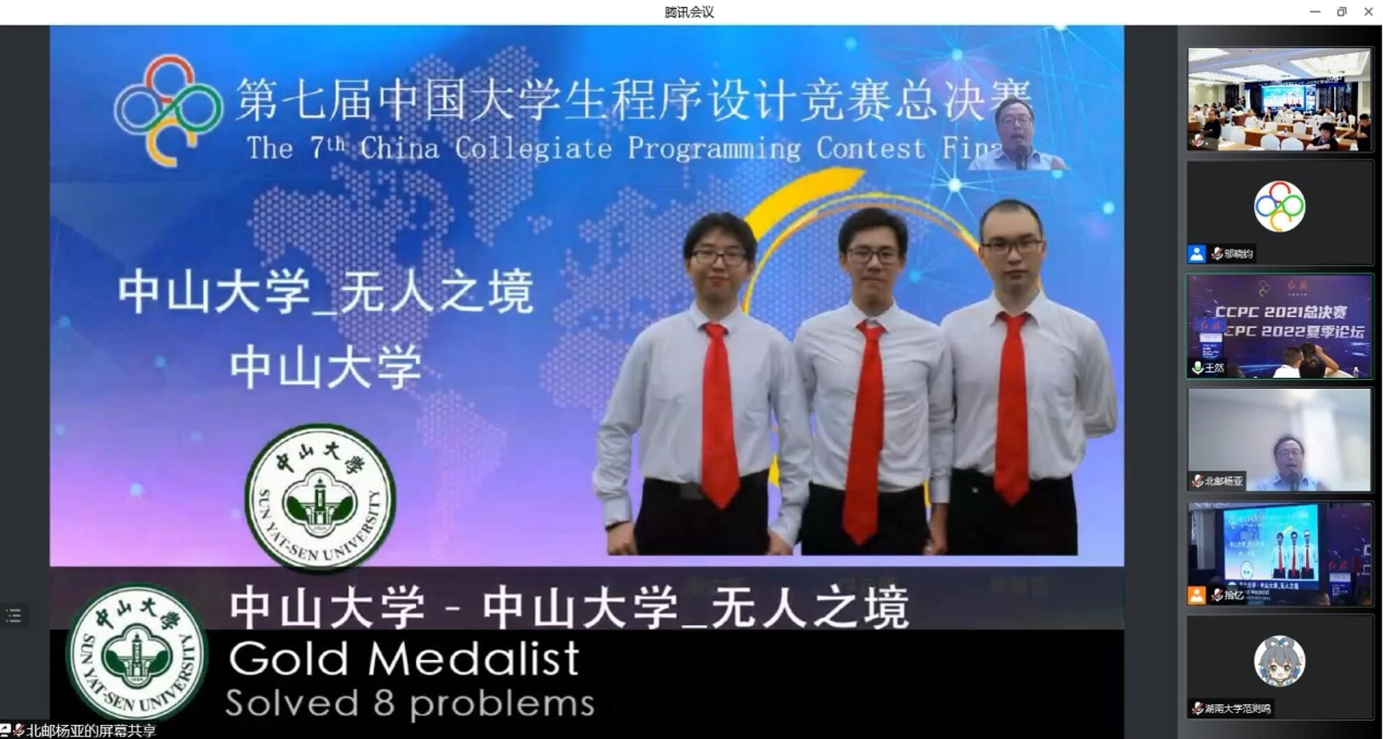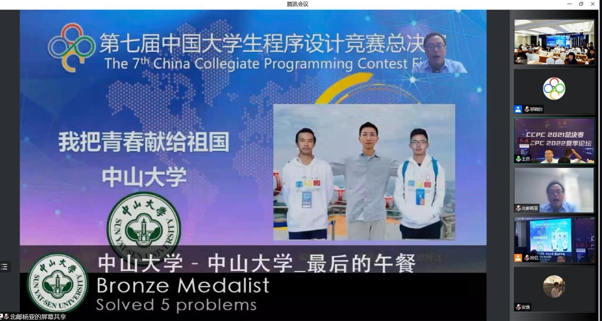 中大新聞網(wǎng)廣州8月18日電(通訊員張子臻)近日,第七屆中國大學(xué)生程序設(shè)計(jì)競賽(China Collegiate Programming Contest,簡稱CCPC)總決賽在南京(線上)順利舉辦。中山大學(xué)計(jì)算機(jī)學(xué)院組織了兩支隊(duì)伍參賽,斬獲金獎(jiǎng)、銅獎(jiǎng)及學(xué)校排名全國第五的佳績。根據(jù)獎(jiǎng)勵(lì)規(guī)則,我校將獲得下年總決賽的一個(gè)獎(jiǎng)勵(lì)名額。
