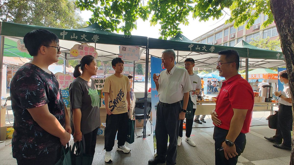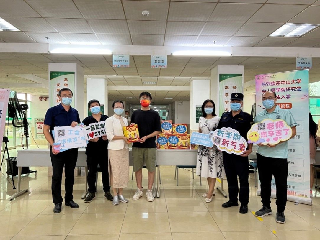 校工會兼職副主席、中山醫學院黨委書記張琪教授(左三),校工會委員李秀紅教授(右三)“送清涼”慰問北校園迎新一線工作人員(來源:校工會)