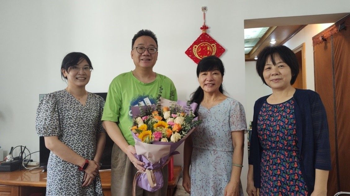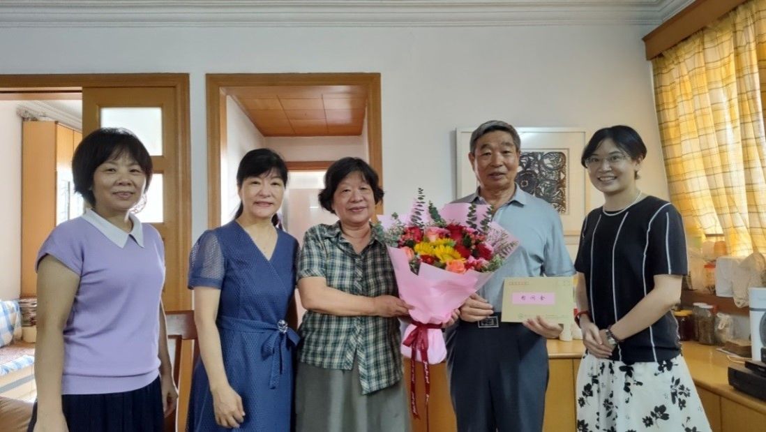 慰問廣東省五一勞動獎章獲得者原校黨委副書記劉美南同志(右二)(來源:校工會)