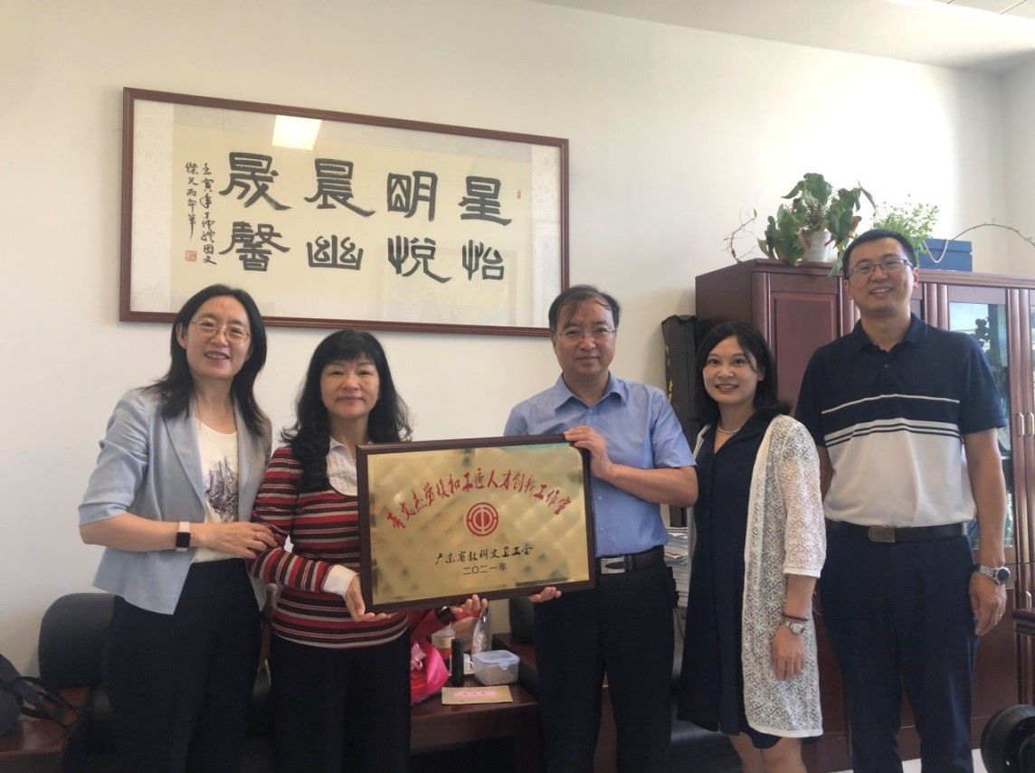 慰問組為廣東省五一勞動獎章獲得者大氣科學學院董文杰教授(右三)頒授“董文杰勞模和工匠人才創新工作室”牌匾(來源:校工會)