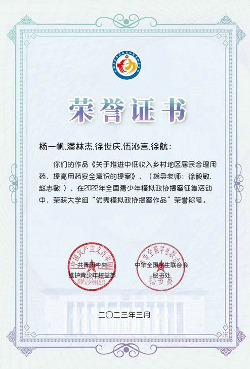 中大新聞網廣州3月8日電(通訊員顧文明、徐毅敏)近日,團中央維護青少年權益部公布了2022年全國青少年模擬政協提案征集活動評審結果。在校團委組織下,我校藥學院楊一帆、潘林杰、徐世慶、伍沁言、徐航五位同學撰寫,徐毅敏和趙志敏兩位老師指導的《關于推進中低收入鄉村地區居民合理用藥、提高用藥安全意識的提案》作品獲評全國青少年模擬政協提案征集活動“優秀模擬政協提案作品”。