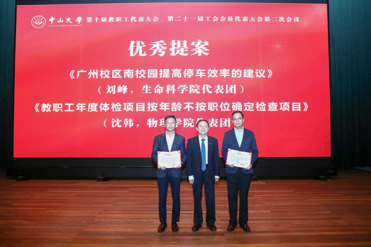 高松校長為榮獲十屆一次教代會“優(yōu)秀提案”的生命科學學院劉峰代表(右)、物理學院沈韓代表(左)頒發(fā)證書(來源:校工會)