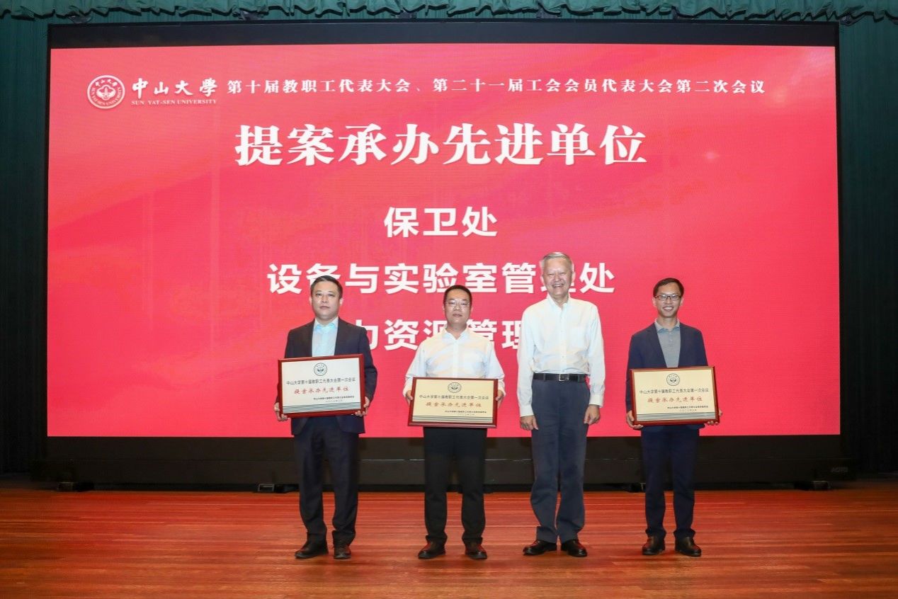 陳春聲書記為榮獲十屆一次教代會“提案承辦先進單位”稱號的保衛(wèi)處、設(shè)備與實驗室管理處和人力資源管理處代表頒發(fā)獎牌(來源:校工會)