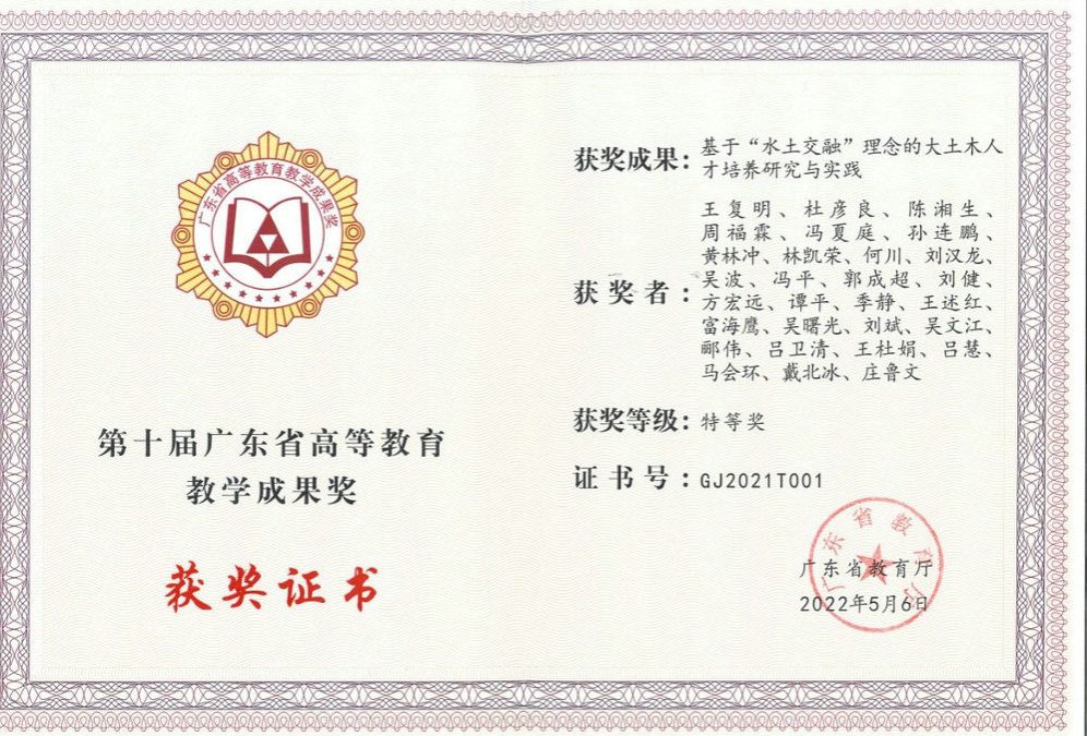 近年來,學院有5位學生應征入伍,其中1人榮立三等功;有4位同學榮獲粵港澳大灣區高校土木工程專業優秀本科畢業生獎;有14位畢業生赴基層就業,畢業生深受用人單位的歡迎和好評。2022年,學院本科畢業生有24人進入世界排名前50的高校繼續深造。王復明院士領銜主持的《基于“水土交融”理念的大土木人才培養與實踐》獲廣東省教育教學成果特等獎。