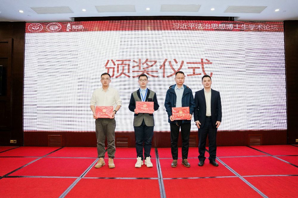 馬克思主義學(xué)院院長(zhǎng)林進(jìn)平教授、黨委學(xué)生工作部部長(zhǎng)鐘一彪為論文三等獎(jiǎng)獲得者頒獎(jiǎng)