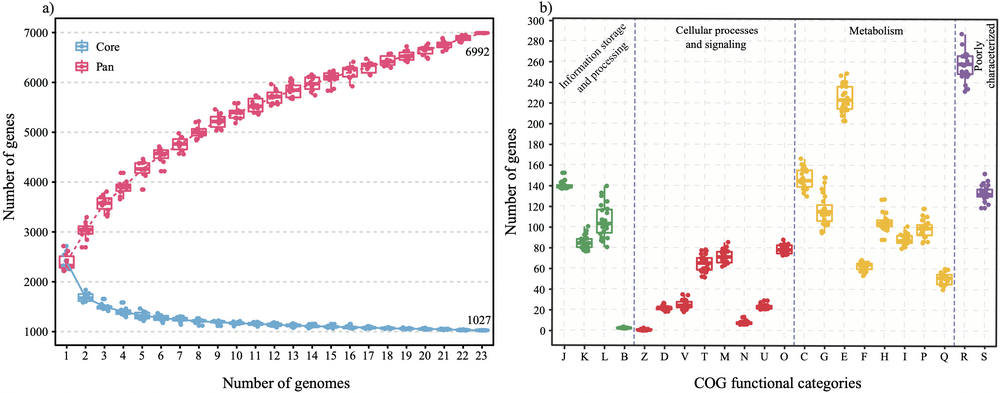 團隊通過比較基因組分析發現,Thermus類群的基因組大小在2.02 Mbp-2.56 Mbp之間,泛基因組包含6992個基因家族,其中有1027個核心基因家族(圖1);此外,COG功能注釋結果表明,Thermus類群具有十分相近的功能類別。因此,盡管Thermus屬典型物種較多,分離地點差異較大,但是整體功能較為保守。