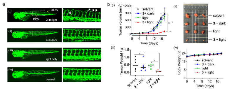 圖3. 光激活的金(III)配合物在斑馬魚中的抗血管生成作用(a)和在小鼠體內的抗癌活性(b)